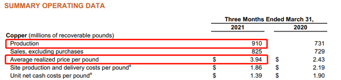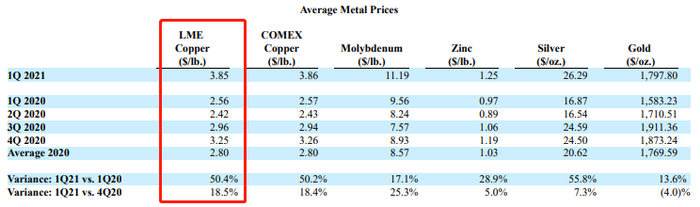 据公司公布的2021年Q1财报来看,公司在第一季度铜的产量约为24万吨,同比减少4.8%。平均售价则为3.85美元/磅,同比增加 了50.4%。