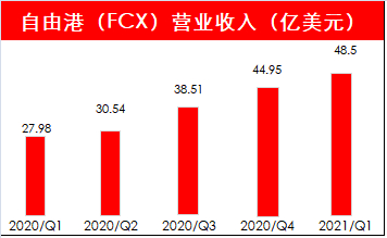自由港是美股上市的最大铜矿公司,总部位于美国亚利桑那州。截止5月6日收盘,公司股价42.07美元,总市值超600亿美元。据公司4月22日公布的Q1财报显示,公司第一季度铜产量同比增长24.5%至9.1亿磅(约41万吨),平均销售铜价同比增长62%至每磅3.94美元。