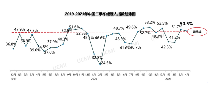 4月份二手车经理人指数为50.5%,处于荣枯线以上,二手车市场处在景气区间。