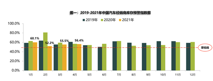 协会发布的最新一期“中国汽车经销商库存预警指数调查”VIA(Vehicle Inventory Alert Index)显示,2021年4月汽车经销商库存预警指数为56.4%,较上月上涨0.9个百分点,对比去年微降0.4个百分点,而库存预警指数位于荣枯线之上,意味着汽车市场处在不景气区间。这也是在今年2月份经销商库存指数降至三年来最低后,该指数连续两个月环比上涨。
