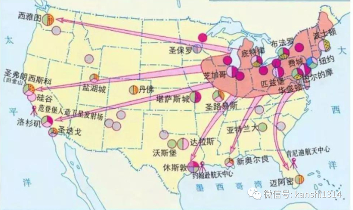 后来美国的人口向五大湖地区集中,原因是美国逐步的进入到了内部产业整合阶段,也就是内需起来了,有自己的工业了,然后需要从内陆地区就近开发各类资源了(成本低),而五大湖地区,是美国各类矿产资源最丰富的地区,同时发展航运成本也低(水路发达),于是美国的工业就在五大湖地区迅速的成长起来了(就是现在的匹兹堡、底特律、芝加哥等)。
