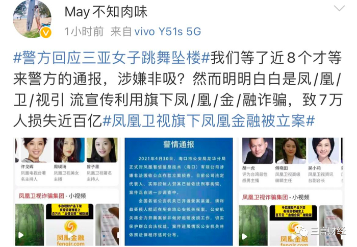 截止目前,仍有大量投资者没能收到回款,引发投资人集体声讨和维权,也将矛头对向凤凰卫视。