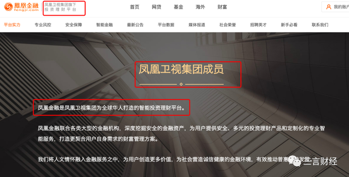 通过凤凰金融此前的官网快照,我们看到能看到“凤凰卫视集团旗下投资理财平台”、“凤凰卫视集团成员”等类似描述。