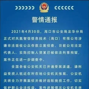三言财经消息,昨日海口公安发布公告称,正式对凤凰金融涉嫌非法吸收公众存款立案侦查,凤凰金融实控人、董事长贺鑫已被刑事拘留。