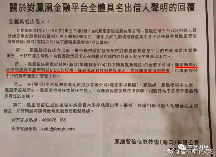 不过凤凰金融称,凤凰卫视因合并间接持有凤凰金融母公司凤新科技8.5%的股权,仅为财务投资人,并非凤凰智信的股东,也未参与过平台的实际运营和管理工作。