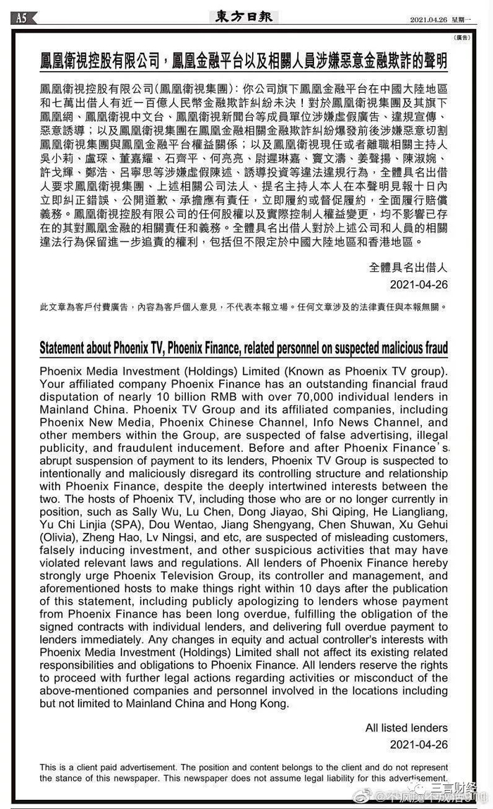 对于投资者在报纸上维权一事,不久前的4月26日凤凰金融同样发报回应。