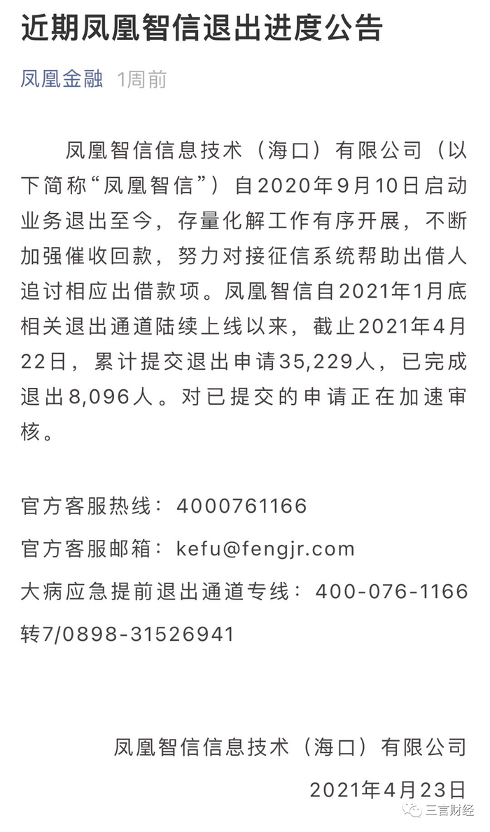 而事实上,截至目前,凤凰金融大面积逾期问题依旧没有解决。据凤凰金融官方消息,截至2021年4月22日,累计提交退出申请35229人,已完成退出8096人。