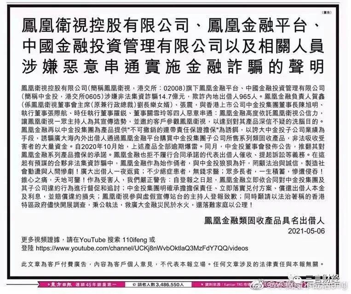 事实上,在投资们的追讨下,凤凰金融开始撇开与凤凰卫视的关系。