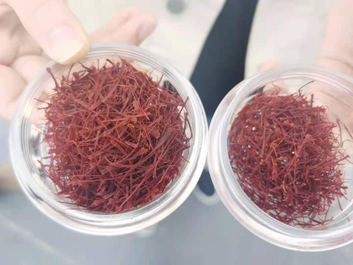 崇明产藏红花(左)比进口藏红花(右)更长、更直