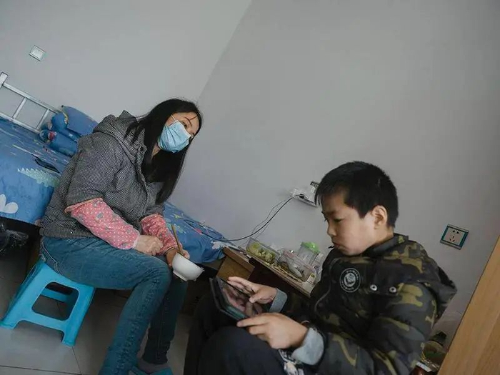出仓后一年多以来,住在五楼的刘艳芳一直独自陪护儿子灿灿。丈夫原本在燕郊送了三四个月外卖,但还有两个孩子留守在老家,也需要照顾,他只能返乡务工。在燕郊治病两年多,10多岁儿子生活完全不能自理,吃饭都得喂上一个多小时。等儿子吃完,刘艳芳才把剩菜剩饭狼吞虎咽地对付几口。
