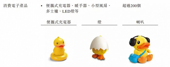 德盈国际将小黄鸭家族授权给各种消费型产品类别的第三方产品,大致分为六大类:
