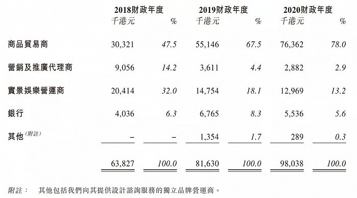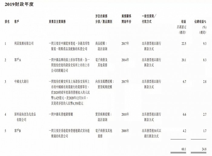 德盈国际的授权客户涵盖多个消费板块,2020年度前五大客户分别是生产鞋服的利讯集团、客户A(三文娱注:应为唯品会)、光大银行、运营小黄鸭奶茶的餐饮公司上海至潮品牌管理和生产销售餐具的黑马科技。2018-2019年的前五大客户中还有华侨城、香港某室内游乐园、深圳前海食为先食品有限公司等。