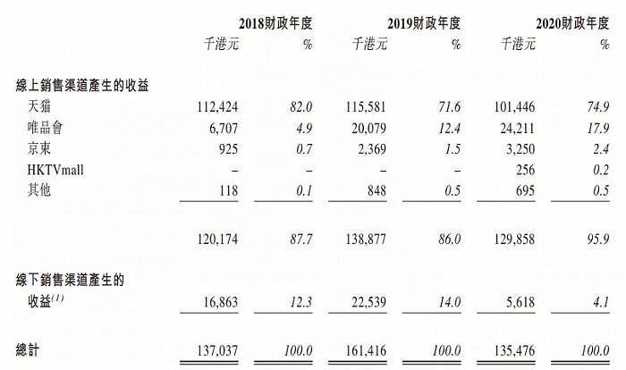 近两年,德盈的唯品会和京东渠道销售收入增长迅猛,不过相比于天猫体量尚小。2020年,德盈来自天猫渠道收益1.01亿港元,唯品会渠道2421.1万港元,京东渠道325万港元,线下渠道受疫情冲击下滑至561.8万港元。