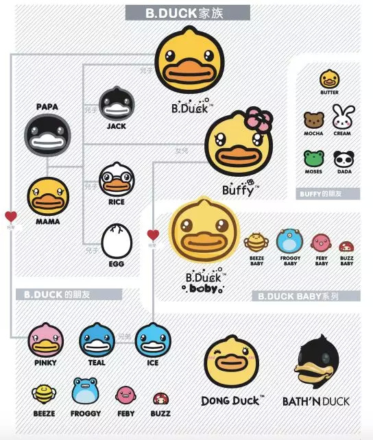 小黄鸭家族有25个角色,主要包括下面这三只鸭子。从2005年创作的小黄鸭衍生出的Buffy和Baby都是主打细分人群,分别面向年轻女性和婴童市场。