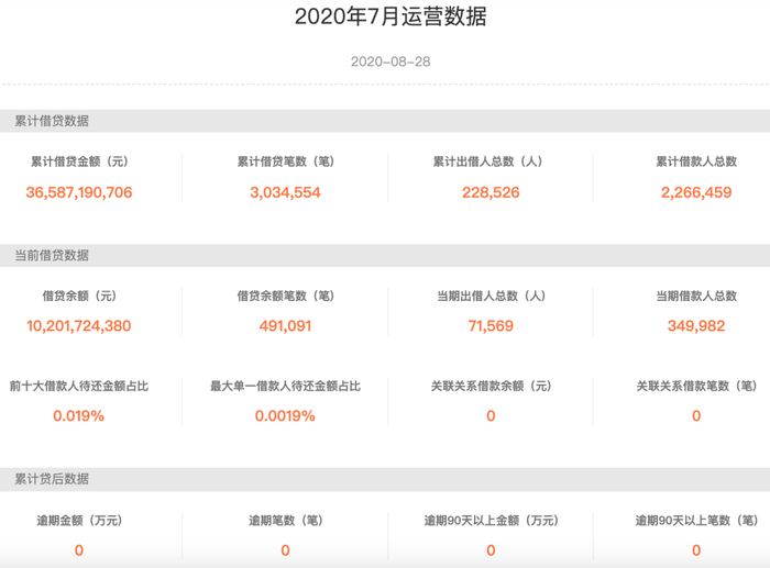 “凤凰金融APP”发布的2020年7月运营数据显示,截止到2020年7月,借贷余额102.12亿,共49万笔,涉及71569人。