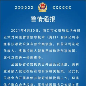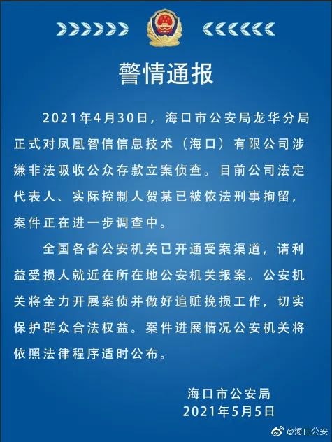 5月5日晚,海南省海口市公安局(下称“海口公安“)通过官方微博发布警情通报称,2021年4月30日,海口市公安局龙华分局正式对凤凰智信信息技术(海口)有限公司(下称“凤凰智信”)涉嫌非法吸收公众存款立案侦查。目前公司法定代表人、实际控制人贺某已被依法刑事拘留,案件正在进一步调查中。