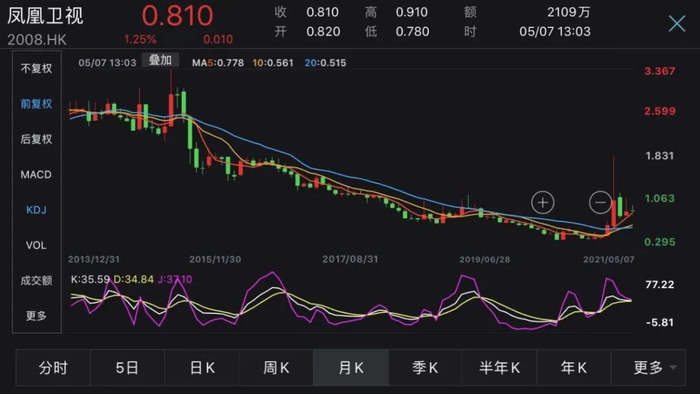 值得注意的是,7日开盘后凤凰卫视低开低走,截至发稿,跌1.22%,每股报0.81港元,较股价历史最高点4.435港元(前复权)下跌81.5%,目前总市值仅有40亿港元。