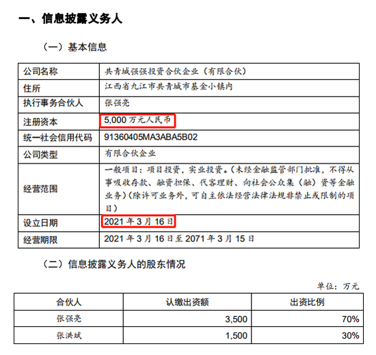 鞍重股份披露,强强投资设立日期是2021年3月16日,注册资本5000万元,合伙人为张强亮和张洪斌,分别出资3500万元和1500万元,经营范围主要是项目投资,实业投资。