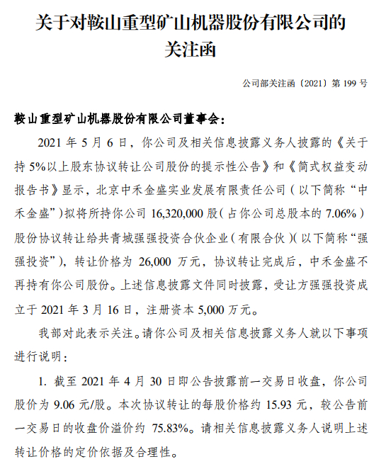 针对最新一次的超高溢价股份转让,5月7日,深交所对鞍重股份发出关注函,要求相关信息披露义务人说明上述转让价格的定价依据及合理性。