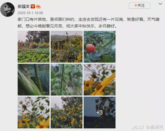 那位记者让张颂文聊聊具体的一个场景。张颂文告诉那位记者:有天傍晚,他在家憋了一整天后,走出家门,刚好看见落日,夕阳洒满了一整片菜地,他心里颇多感慨,就在那儿站了很久。