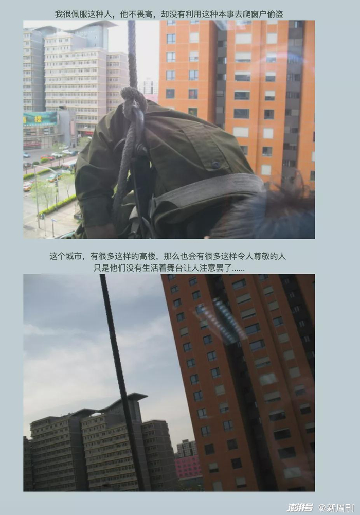 他是这样写的:“窗外,一个小男孩悬挂在半空清洁窗户,他深深地吸引着我。他身上的安全措施很简单,所以手指会下意识地紧扣着窗户。我很佩服这种人,他不畏高,却没有利用这种本事去爬窗户偷盗。这个城市,有很多这样的高楼,那么也会有很多这样令人尊敬的人,只是他们没有生活的舞台让人注意罢了……”