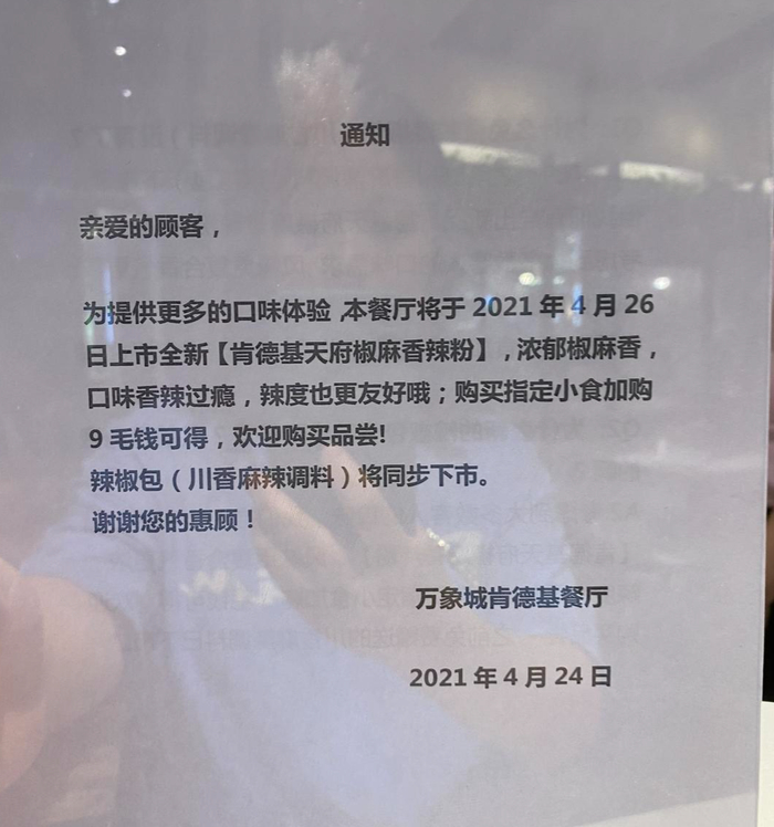 据媒体报道,在四川成都,“肯德基天府椒麻香辣粉”4月26日开始实行收费。以往免费的辣椒包(川香麻辣调料)同步下市。