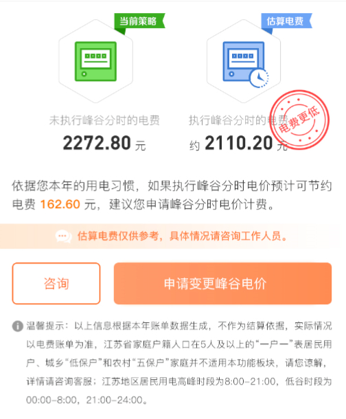 居民可查询当期用电费用,并与执行峰谷分时电费的预估值进行比较,获取是否变更当前电费计价方式等合理化建议。