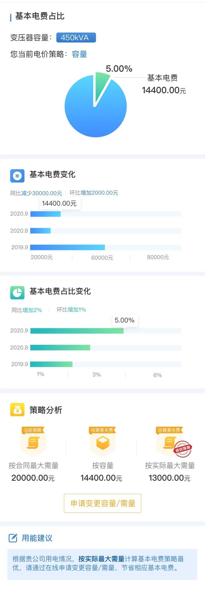 与居民客户不同,执行两部制电价的企业(变压器容量在315千伏安及以上的一般工商业及其他客户)电费分为两部分:一部分是按照変压器的容量或需量计收的基本电费,另一部分是按照用电量计收的电度电费。企业通过能效账单可以查询到自身的基本电费信息、不同计费方式的用电策略对比分析与用能建议,进而选择最优基本电费计算方式,降低企业基本电费支出。