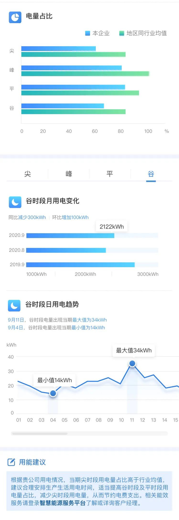 企业可以查询用电高峰、平谷各时段的电量与本地区同行业均值的差异、月用电变化、日用电趋势及用能建议,根据分析结果和用能建议合理安排生产生活用电时间,降低用电成本。