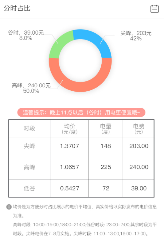 使用能效账单后,他不但看到了店铺每天不同时段的用电量,还掌握了近两年店铺每个月的用电情况。更让他意外的是,通过能效账单展示的电价对比图,他发现尖峰、高峰、低谷三个不同时段的电价差异明显。