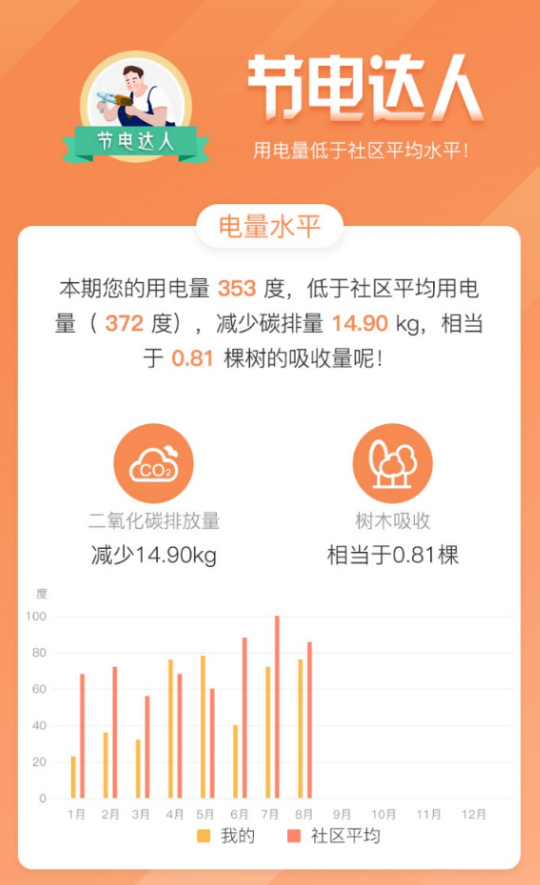 居民可查询电量水平、日用电特点等信息,依据用电情况,获得“节电达人”“波澜不惊”“自律强人”“用电土豪”等专属形象标签。