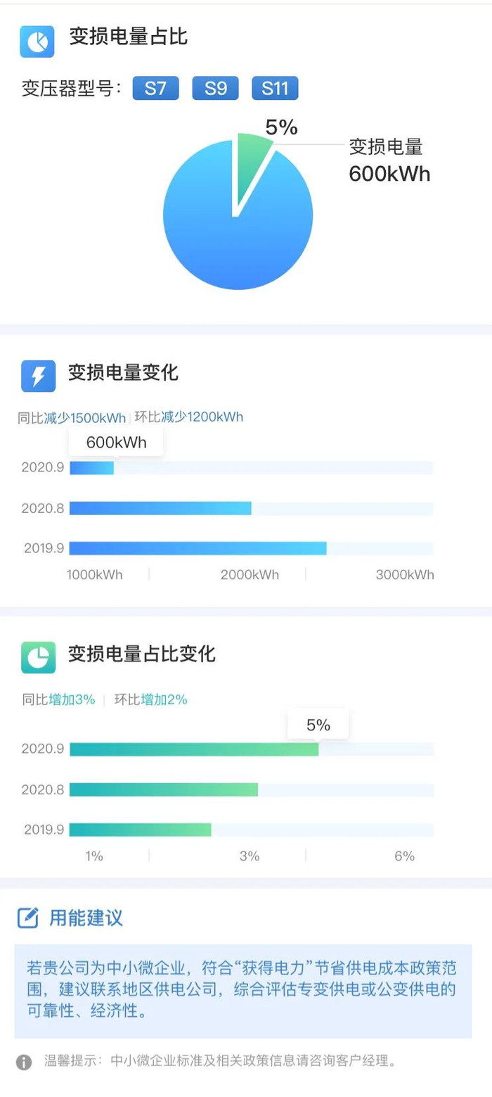 变损电量指因变压器本身的损耗而产生的电量,企业可以查询所用变压器型号、变压器损耗电量,了解账单当期变损电量情况并进行下一步优化。