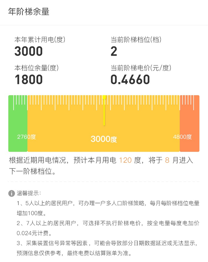 居民可查询自己本年的累计用电量、当前所处的用电阶梯档位、本档位余量、当前用电单价等信息。