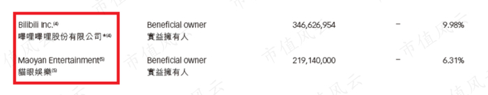 欢喜传媒的第二、第三大股东分别是B站和猫眼娱乐,两者分别持有欢喜传媒9.98%和6.31%的股份。
