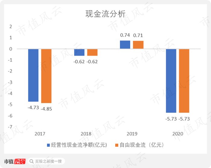 公司的现金流表现得也是同样糟糕,经营性现金流净额和自由现金流在2019年分别为0.74亿元和0.71亿元。