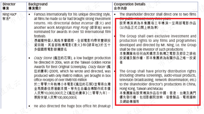 如果宁浩有任何构思或者想法,那么欢喜传媒将拥有排他的投资权和制作权,欢喜传媒是且只能是唯一的投资者。另外,公司还拥有宁浩作品在国内的优先发行权。