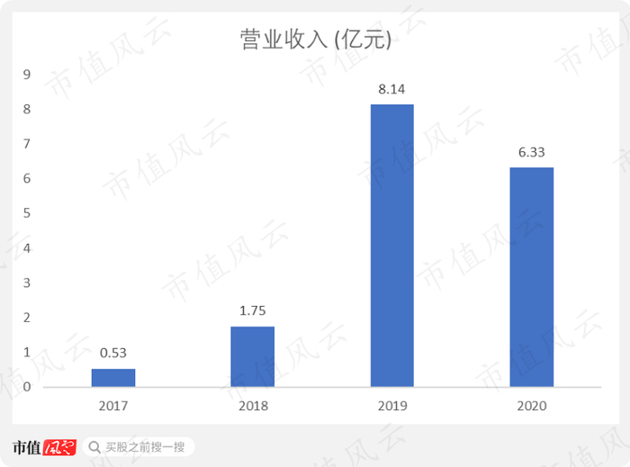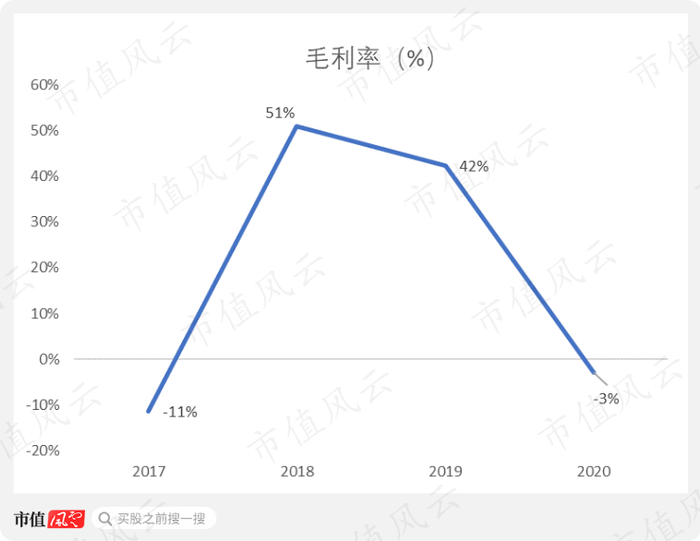 毛利率方面,公司表现得极不稳定,比如2020年的营业收入达到6.33亿元,和2018年的1.75亿元相比,要多很多,但是2018年的毛利率高达51%,而2020年的毛利率竟然为负的3%。