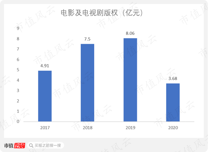 电影及电视剧版权从2017年的4.91亿元增长至2019年的8.06亿元,后下降至2020年的3.68亿元。