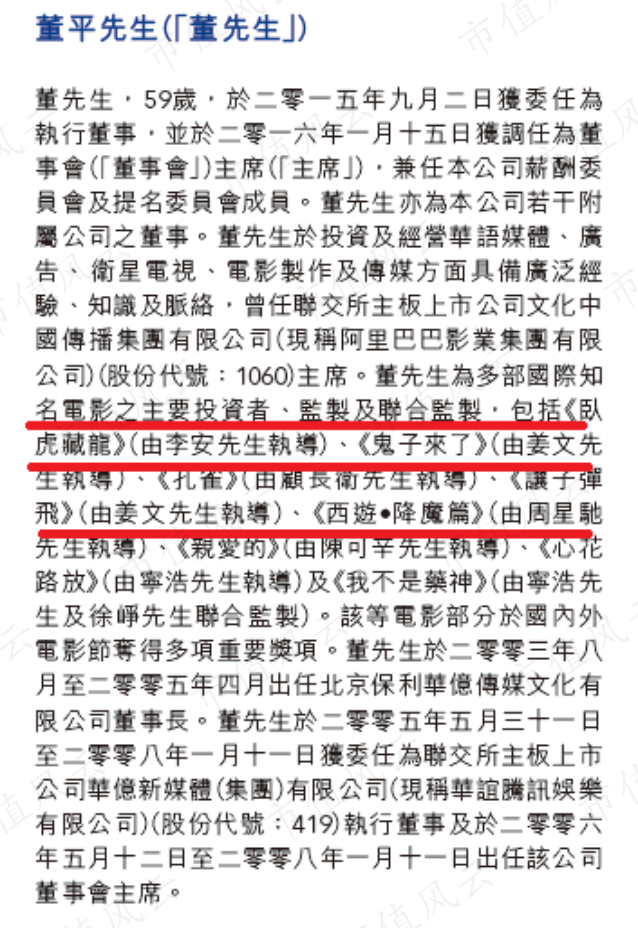 董平是欢喜传媒的董事会主席兼执行董事,董平曾是多部国际知名电影的主要投资者、监制以及联合监制,包括《卧虎藏龙》、《让子弹飞》以及《西游·降魔篇》等。项绍琨是公司的执行董事兼CEO,公开资料显示项绍琨曾长期从事律师工作。