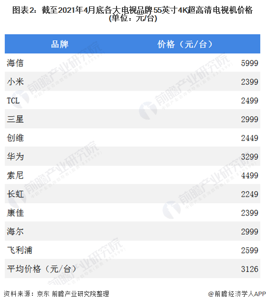 以销量较高,消费者普遍购买到的55英寸4K超高清电视机价格为例,截至2021年4月底各大电视品牌55英寸4K超高清电视机价格在2249-5999元/台,平均价格逐渐稳定在3000元/台左右。