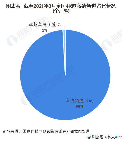 根据国家广播电视总局公布的消息,截至2021年3月底,全国各级播出机构经批准开办高清电视和超高清电视频道845个,其中高清频道838个,4K超高清频道7个,分别为中央广播电视总台、北京台、上海台、广东台、广州台、深圳台、杭州台。未来4K超高清频道数量还有较大的增长空间,带动4K超高清电视终端的发展。