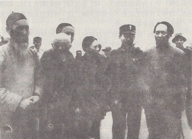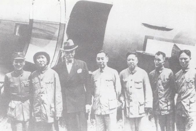 1945年10月11日,毛泽东离开重庆返回延安时,在重庆九龙坡机场同张澜(左一)、张治中(右二)、邵力子(左二)及其夫人傅学文(左三)、郭沫若(邵力子身后)的合影,毛泽东身后戴礼帽者为蒋泽民