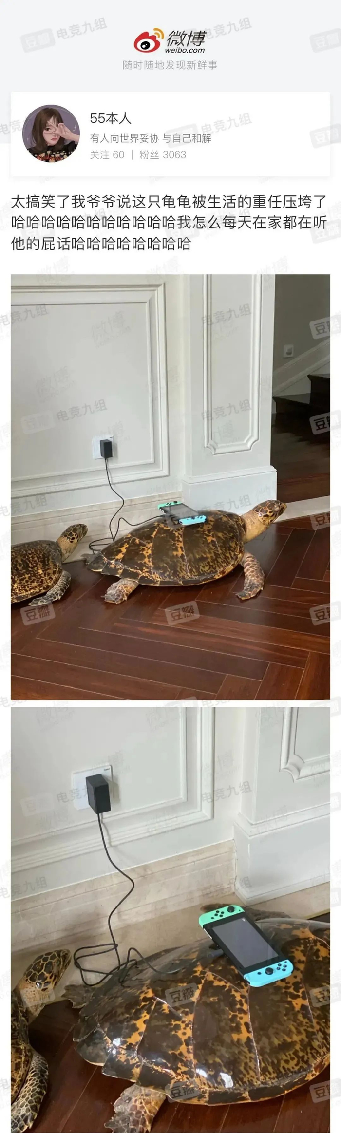 在豆瓣上,有网友发布的截图显示,微博用户@55本人 于4月21日16时12分发布一条微博称,“我爷爷说这只龟龟被生活的重任压垮了。”并配两张图片。图片显示,她将一部Switch游戏机放在其中一只玳瑁标本上充电。目前前述微博已被删除。