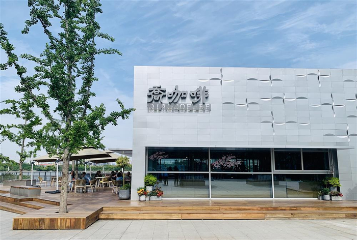 除了内在的中西合璧,乔咖啡的外观设计也颠覆了人们对老字号保守的刻板印象:西岸店金属感的外立面与徐汇滨江整体风格融为一体,室外不仅有观景座椅,而且贴心地为带宠物的顾客留出了系宠物的空间;室内一半用木结构做成栅栏状的隔断,暗指“乔家栅”, 另一半用大面积窗户将江景引入……很多消费者经过店员提醒才意外发现:这居然是老字号开的咖啡馆。