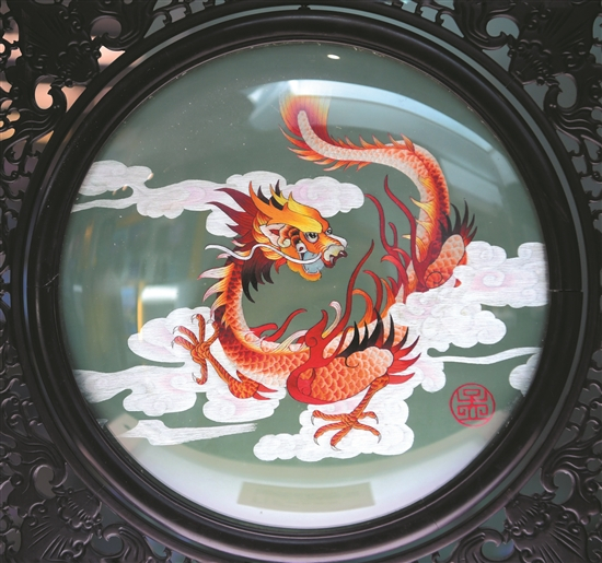 蜀绣展区展出了蜀绣国家级代表性传承人孟德芝带来的20余件蜀绣精品。其中,双面绣《红叶熊猫》用“丝毛针”呈现“国宝”熊猫憨态可掬的神态;《长毛狗》用“施毛针”绣出逼真的动物毛发;《芙蓉鱼》则将蜀绣代表性图案——鲤鱼和成都市市花——芙蓉花生动结合;双面异色、异型绣作品《龙凤呈祥》,一面是飞龙、另一面是翔凤,令人赞叹不已。