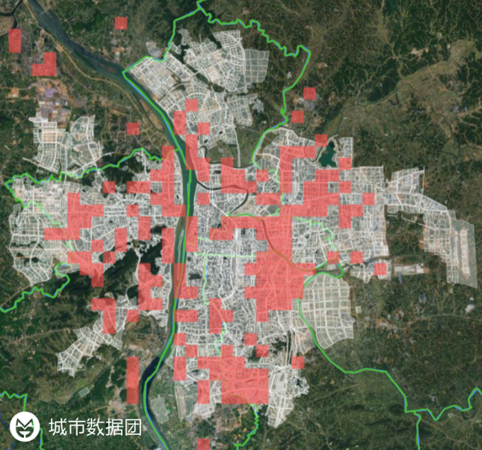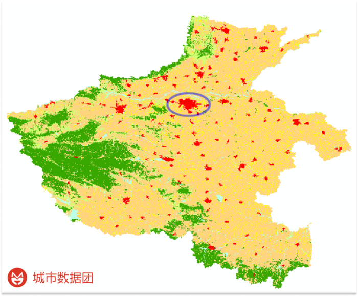 虽然来自于国家专业机构,但为了尽可能提高精确度,与现实情况匹配,我们又做了大量的人工辨认和识别,对每个1公里×1公里的栅格都重新确认了其土地开发用途类型。然后在Datlas中对其进行了矢量化,将郑州区域中用地性质为“城乡、工矿、居民用地”的部分也画到地图上,请看下图: