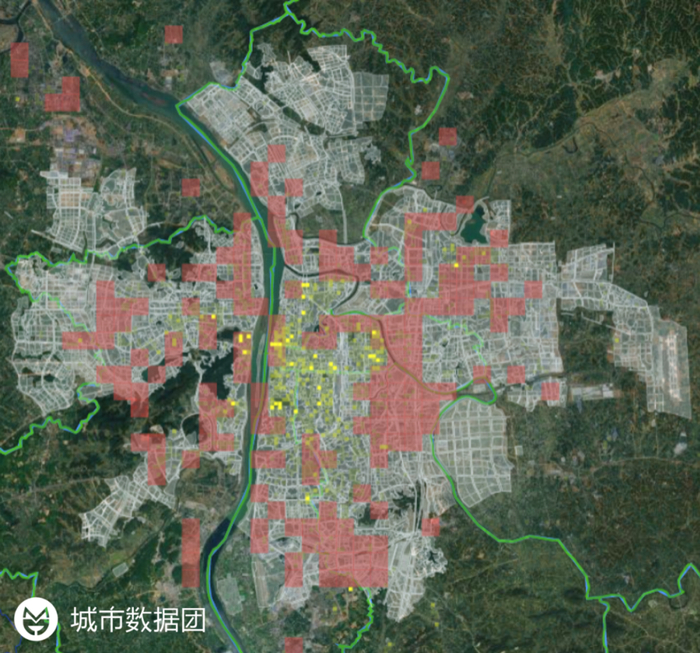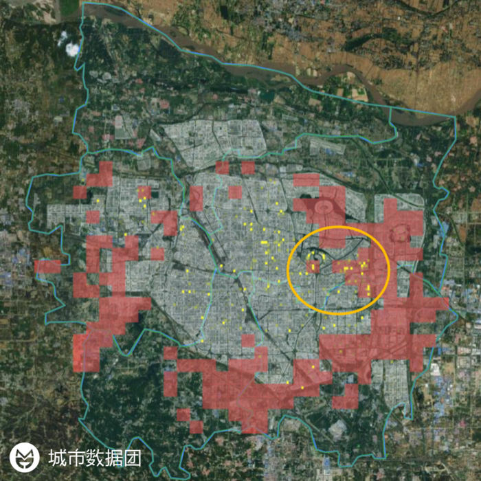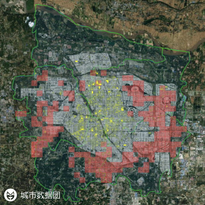 图中的黄色热力图斑,即是郑州市的夜间人口(居住人口)分布情况。为了方便读者观察,我们调整了参数,重点标识出了夜间人口密度较高的区域,简单来说,黄色越亮人口密度越高。