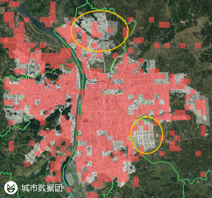 长沙的实际土地开发小于规划范围,如图中黄线圈出所示,开福区北部的金霞组团和长沙县的黄黎组团甚至没有得到实质上的土地开发。