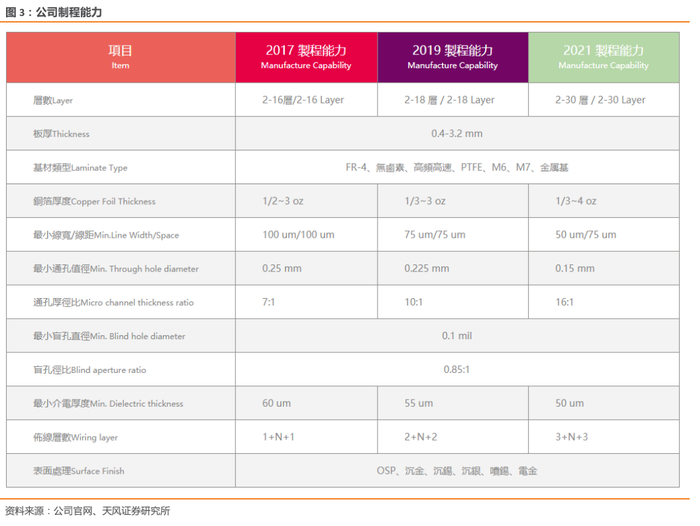 公司制程能力&产品结构:公司制程能力不断提高,从17年到2-16层提升到21年的2-30层,目前公司板厚为0.4-3.2mm,最小线宽线距可以做到50um/75um,最小通孔直径可以到达0.15mm,通孔厚径比为16:1。目前公司产品结构为:≤4L、6~8L、10-12L、≥14L分别占比为35%、57%、8%、0.28%。
