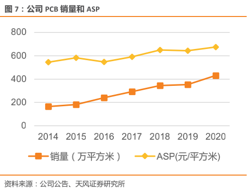 产能持续扩张,叠加产品结构升级贡献利润增量。2017年公司产品下游主要应用于消费电子、通信设备、计算机等领域,2017年上半年营收占比为35%、22%、16%。随着公司募投项目的持续推进(年产120万平方米高精密印制电路板建设项目和年产80万平方米汽车电子印制电路板建设项目),公司产能持续扩张。在产能持续扩张的基础上公司依旧保持高产能利用率,2014-2020年公司产销率保持高位,均高于97%,销售收入稳定增长。产能扩张带来规模效应叠加产品结构优化带来PCB产品毛利率的显著提升,单/双面板的毛利率由2017年的17%提升到2020年的24%,多面板毛利率有2017年的20%提升到2020年的22%,贡献利润增长点。产能扩张叠加产品技术升级推动公司业绩增长。